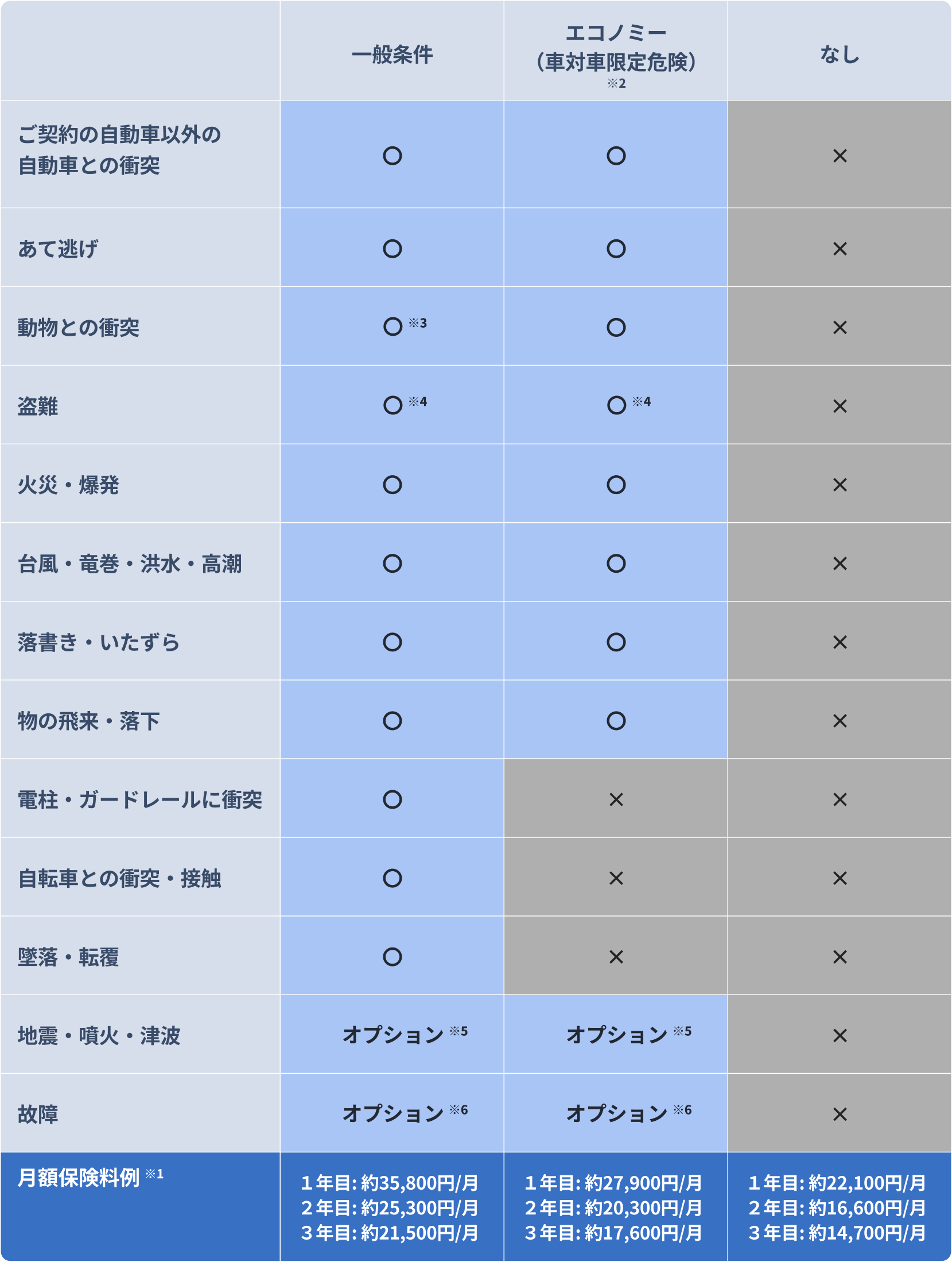 | 車両保険 | 一般条件および車対車事故・限定危険特約 (自己負担額:5-5万円) (車両保険金額:1年目=50万円 2年目=35万円 3年目=25万円) |
